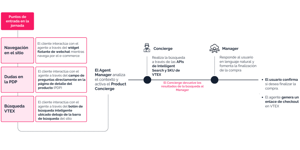 El agente fue integrado con la búsqueda de VTEX, permitiendo consultas a partir de términos populares utilizados por los consumidores—incluidos aquellos que antes no coincidían con la nomenclatura técnica de los SKUs—ampliando significativamente el descubrimiento de productos.